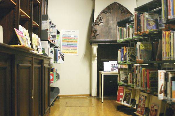 Ook binnen is de grandeur op elke verdieping behouden. In de vroegere kelderkeukens met de authentieke granitovloeren en mozaïeken is de jeugdafdeling ingericht, met werk van kinderen aan de muur en échte knuffels, leuk voor tijdens de zaterdagse voorleesbeurten. De trap, die natuurlijk kráákt, brengt je naar het voormalige neogotische bureau van de rechter waar nu de weetjesboeken staan. Van hieruit kun je door luikjes en glas-in-loodramen loeren naar de uitleenbalie in de moderne aanbouw met uitzicht op de tuin. Verder kom je via vleermuizen in gesculpteerd hout en beschilderd stucwerk - iets met de familienaam van de echtgenote van de rechter, denkt Lambrecht - in de verschillende kamers en een zonovergoten erker waar je de krant kunt lezen. De bib krijgt er een rijke uitstraling door, maar het blijft creatief omgaan met budgetten: "De rekken zijn een erfenis, onze tafels zijn wat refterachtig, er is nog geen koffie voor de bezoekers... Er zijn nog groeikansen, ook in de bibtuin."