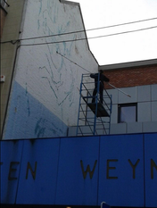 De kunstenaar, bekend van een hele reeks muurschilderingen in de stad, toverde op korte tijd de schaduw van een dreigende zwarte wolf op de blinde muur van een aanpalend pand.