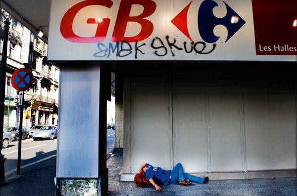 Bij de ingang van de Delhaize op de Anspachlaan staat er, gewoontegetrouw, een dame of heer met kind te bedelen. Wat verder liggen er altijd dronken personen op karton en onder dekens hun roes uit te slapen of ruzie te maken. Natuurlijk zijn de honden ook van de partij. Van de Delhaize naar mijn appartement. Honderd meter misschien, maar ik moet oppassen dat ik niet over een bedelaar val die zich in het midden van de stoep heeft geposteerd. Ondertussen staan, liggen of zitten de bedelende habitués van jaren ook nog links en rechts van de stoep.