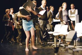 O f de zenuwen strak gespannen staan? "En geen klein beetje," bekent regisseur Koen Boesman. "Maar we zitten met de kloten voor het blok . We moeten zaterdag een laatste keer alles uit de kast halen, en die spanning helpt om alles te geven. Het verschil met het Landjuweel is dat we toen tussen gelijken stonden: de beste amateurgezelschappen van het land. Nu staan we tussen de grote jongens, in diezelfde, supergrote zaal van het Kaaitheater."