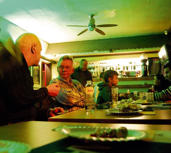 Bij het binnengaan piept en knelt de aluminium deur van het etablissement. Buiten is het donker, de sfeer een tikkeltje louche. Binnen een handjevol mensen, op de tafels borrelhapjes, blokjeskaas en af en toe een pint. Er zijn geen leeuwenvlaggen.