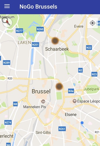 © Zo ziet het startscherm van 'No Go Brussels' eruit. De bruine plekken duiden de gevarenzone's aan.