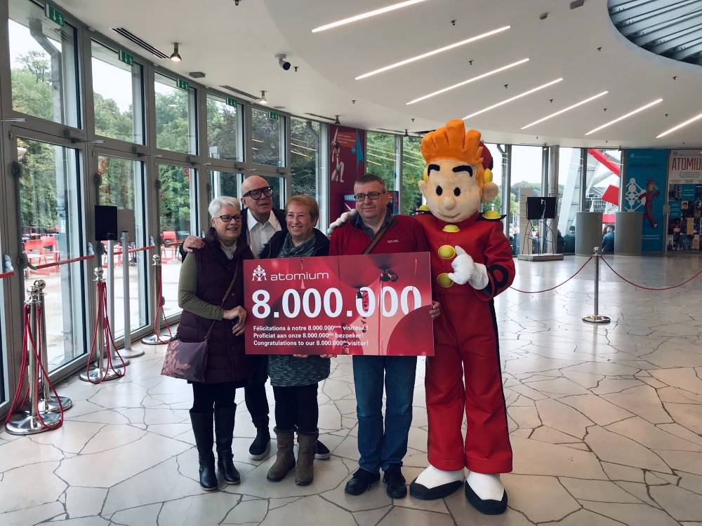 Om het behalen van de mijlpaal te vieren kreeg deze bezoeker samen met haar familie gratis toegang tot het Atomium inclusief gidsbezoek, een goedgevulde goodiebag en een bos bloemen.