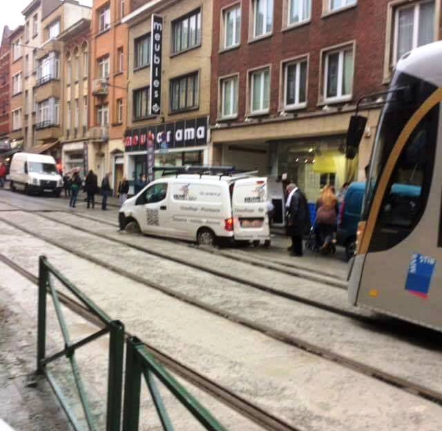 Een witte bestelwagen reed over het versgestorte beton en kwam daardoor vast te zitten. Het voertuig blokkeerde zo ook de trams op de lijn 55, meldt Franstalige regionale omroep BX1.