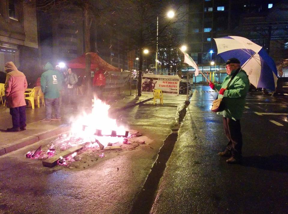 Aan de Frankrijkstraat achter het station bemannen spoorwegmilitanten een piket. Het is er gezellig, met muziek en een vuurtje. Het groepje moet in principe een filterblokkade inrichten. Alleen zijn er geen auto's. "Verderop op de Industrielaan is er ook al een blokkade, dus raken de auto's hier helemaal niet", weet een ACV-militant met een overgedimensioneerde paraplu.