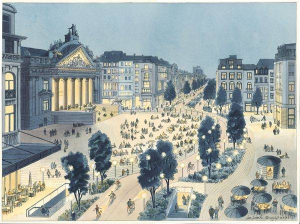Schuiten tekende een Beursplein dat "een plaats van gezellige ontmoetingen moet worden, met banken en lichtgevende tafels die picknickers en schaakspelers ontvangen of gewoon als ontmoetingsplaats dienen".