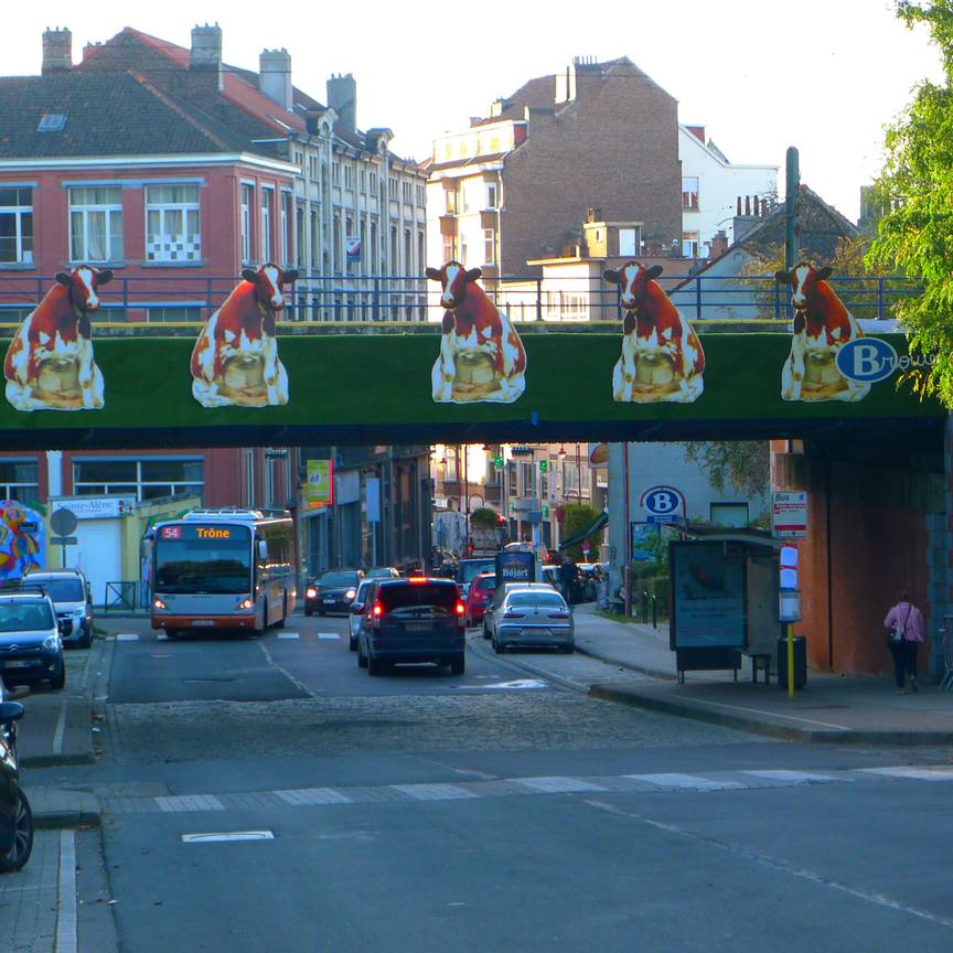 De Vanpébrug in Vorst is opgesmukt met enkele grazende koeien. Het plaatselijke kantoor van Atrium wil zo de winkelwijk rond het Sint-Denijsplein aantrekkelijker maken.