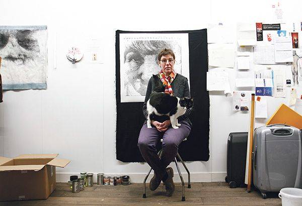 Het appartement van Marie Ange staat vol open kasten, gevuld met pigmenten, borstels en potloden. Hier en daar hangt een van haar kunstwerken tegen de muur. De houten vloer en de grote tekentafels maken helemaal duidelijk dat ik in een atelier ben beland.