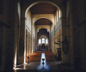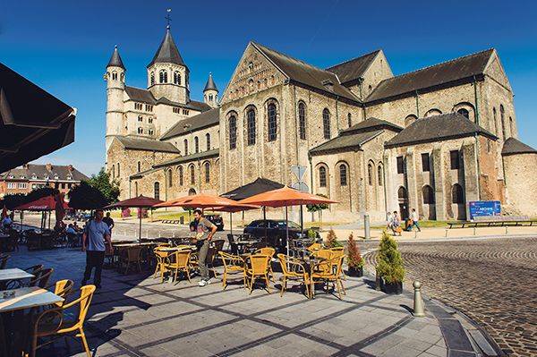 Dé trekpleister van Nijvel is uiteraard de kapittelkerk, la collégiale. De kerk werd gesticht als kloosterkerk rond het jaar 750 door de weduwe van Pepijn de Oude, hofmeier van Koning Dagobert. Over oud gesproken! De eerste abdis was Sint Gertrudis (daar is ze weer), die stamde uit een hele familie van heiligen. Ook zij werd vereerd na haar dood en onder de Ottoonse keizers verrees de kerk die ook vandaag nog steeds indrukwekkend is. Een schoolboekversie van vroeg-romaanse en sobere bouwkunst. Buiten domineert de torenkant met forse muren. Die overleefden het bombardement, maar dak en binneninrichting van de kerk gingen eraan. Binnenin zien we een schip van meer dan honderd meter lang. Door de huidige kaalheid van het interieur lijkt het wel alsof het een modern bouwwerk is, maar het is ook weer zó oud dat we er nog goed de vorm van een Romeinse basilica (gerechtsgebouw) in herkennen, met aan beide zijden een koor.