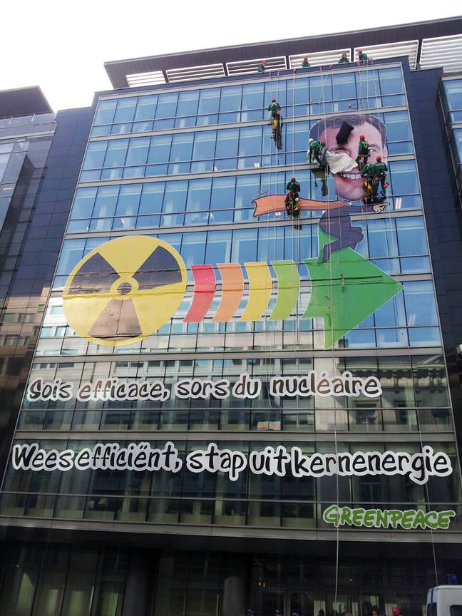 De voorbije maanden verschenen vooral boodschappen van het Nucleair Forum - de kernlobby - in het straatbeeld. Vandaag maandag biedt het kabinet van Wathelet in de Wetstraat een wat andere aanblik. "Melchior, wees efficient en stap uit kernenergie!", luidt de 17 op 20 meter grote boodschap die Greenpeace-activisten maandagochtend plakten op het kabinet van staatssecretaris voor energie Melchior Wathelet.