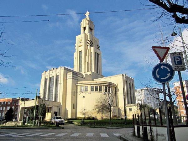Tijdens de Eerste Wereldoorlog worden de funderingen gelegd voor een Byzantijnse kerk, maar door geldgebrek valt de bouw stil. Eind jaren 1920 krijgen twee jonge architecten de opdracht een ander ontwerp te maken, op basis van het nieuwe bouwmateriaal beton. Als grondvorm nemen ze de combinatie van een Grieks kruis en de cirkel van de heilige hostie.
