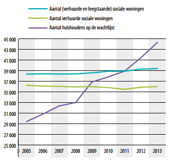 Gezinnen met een laag inkomen krijgen het daarom steeds lastiger de huur op te hoesten. Het aantal gezinnen op de wachtlijst voor een sociale woning neemt toe: de teller stond in 2012 nu al op 41.461. Er wordt, met 46,4 procent, aan minder dan de helft van de aanvragen voldaan. Voor 2013 wordt verwacht dat de wachtlijsten nog meer aangezwollen zullen zijn.