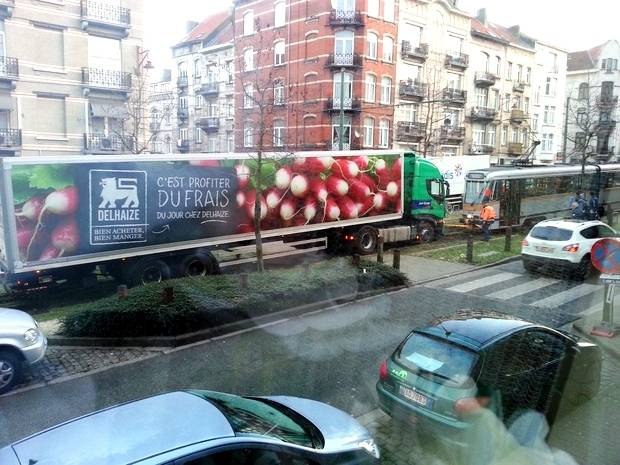 De vrachtwagen raakte klem op de Wielemans Ceuppenslaan. Of de chauffeur de slogan op zijn voertuig 'C'est profiter du frais du jour chez Delhaize' nog zal kunnen waarmaken is meteen onduidelijk.