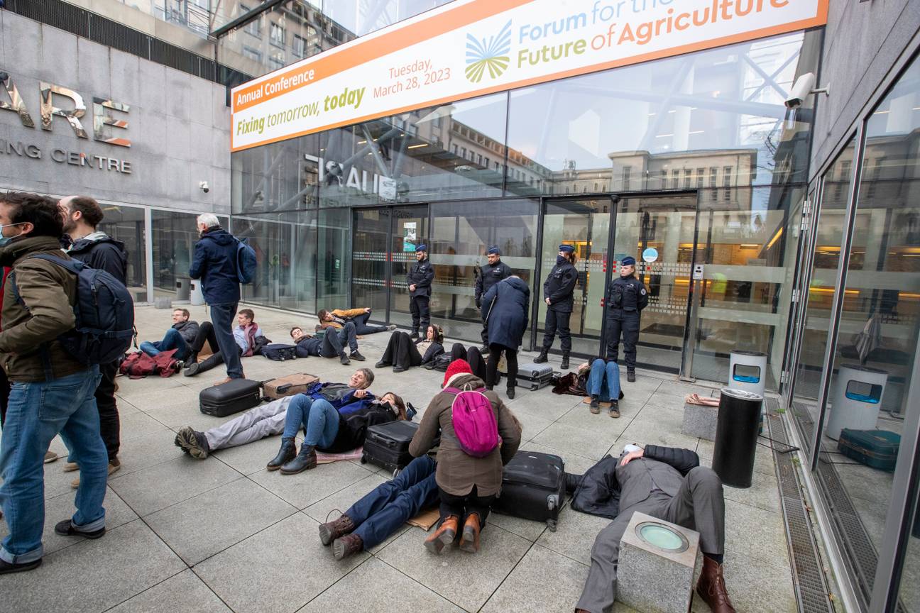 Zowat zestig activisten van het collectief 'Geen toekomst voor de agro-industrie' hebben dinsdag de ingang geblokkeerd van het Forum voor de Toekomst van de Landbouw (FFA) in Brussel. Ze verwijten de organisatoren aan "greenwashing" te doen.