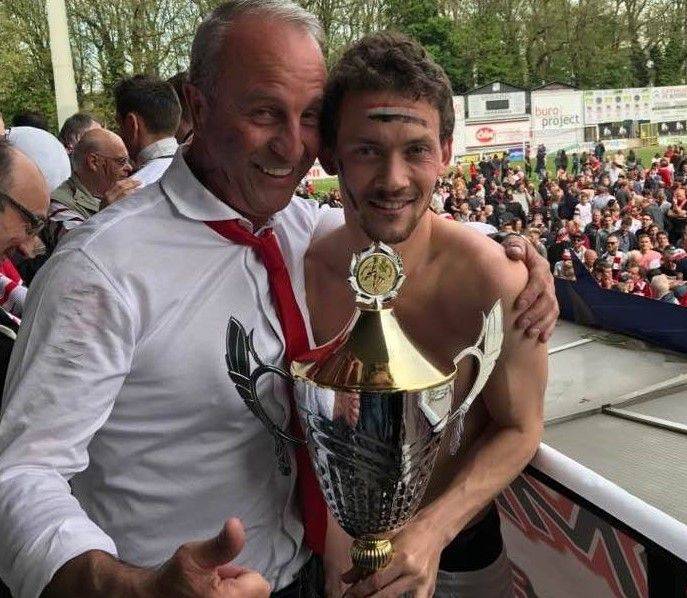 | Bestuurslid Vander Eeckt (l) en speler Cabeke (r) vieren de titel in de tweede amateurklasse in 2017.