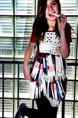 "Op Disney Channel had ik een meisje gezien dat een kleedje droeg gemaakt van stiften, en zo kwam ik op het idee," vertelt Linde over haar ontwerp. "Wij hebben balpennen gebruikt in plaats van stiften. En omdat we niet genoeg pennen hadden, hebben we de boven- en achterkant van het kleedje volgehangen met speelkaarten."