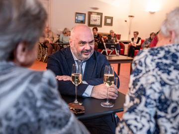 | Burgemeester Christos Doulkeridis voor de ingang van de Gulden Vliesgalerij