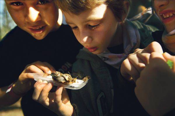 "Welkom op Buitenspeeldag!" zegt ze. "Zijn jullie klaar voor het wereldkampioenschap slakkenspurt?" vraagt ze aan twaalf nieuwsgierige kids. Robbe, José-David, en co. weten eerst niet goed wat ze ervan moeten denken. "Ja, jullie zijn een beetje verrast, zie ik. Slakken zijn misschien niet de allersnelste beestjes, maar ze zijn echt wel heel sportief. Ik heb vandaag voor jullie de slakken meegebracht die heel knap zijn in euh... spurten eigenlijk. Ze zijn de beste ter wereld!" En ze haalt een doosje boven waar zo'n zeven slijmerige slakken in zitten: een heel donkere, een slak waar nog een ander piepklein slakkenhuisje op vastzit ("Die vond geen babysit vandaag," zegt Tine), een slak met een groot kruis boven op de rug. "Dat is zeker een katholieke!" roept Nolan, en iedereen schiet in de lach.